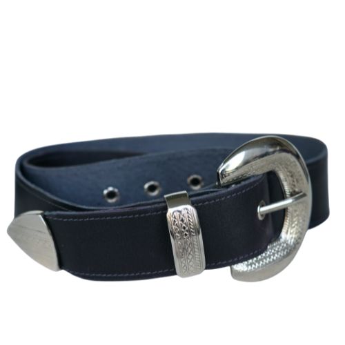 Este cinturón de cuero negro con hebilla y punta plateada fue fabricado a mano por nuestros artesanos. Es un accesorio que marcará la diferencia en todos tus looks.